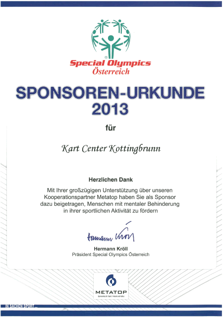 Special Olympics Austria bedanken sich mit der Sponsoren-Urkunde 2014 beim Kartcenter (hier), 2013 (hier), 2012 (hier).
